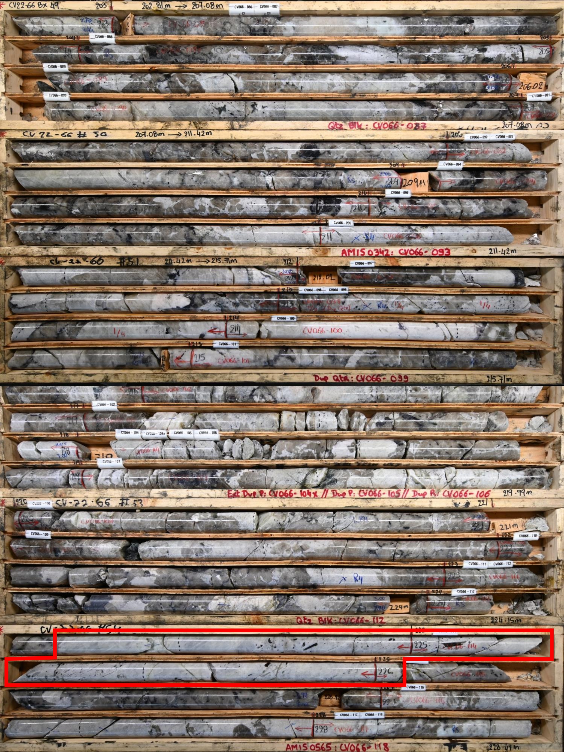 Figure 2: Well mineralized drill core intersection (~2.5% Li2O average) in CV22-066 with a 2.0 m at 6.41% Li2O interval (224.0 to 226.0 m) containing an ~1.8 m long spodumene crystal (highlighted in red box)