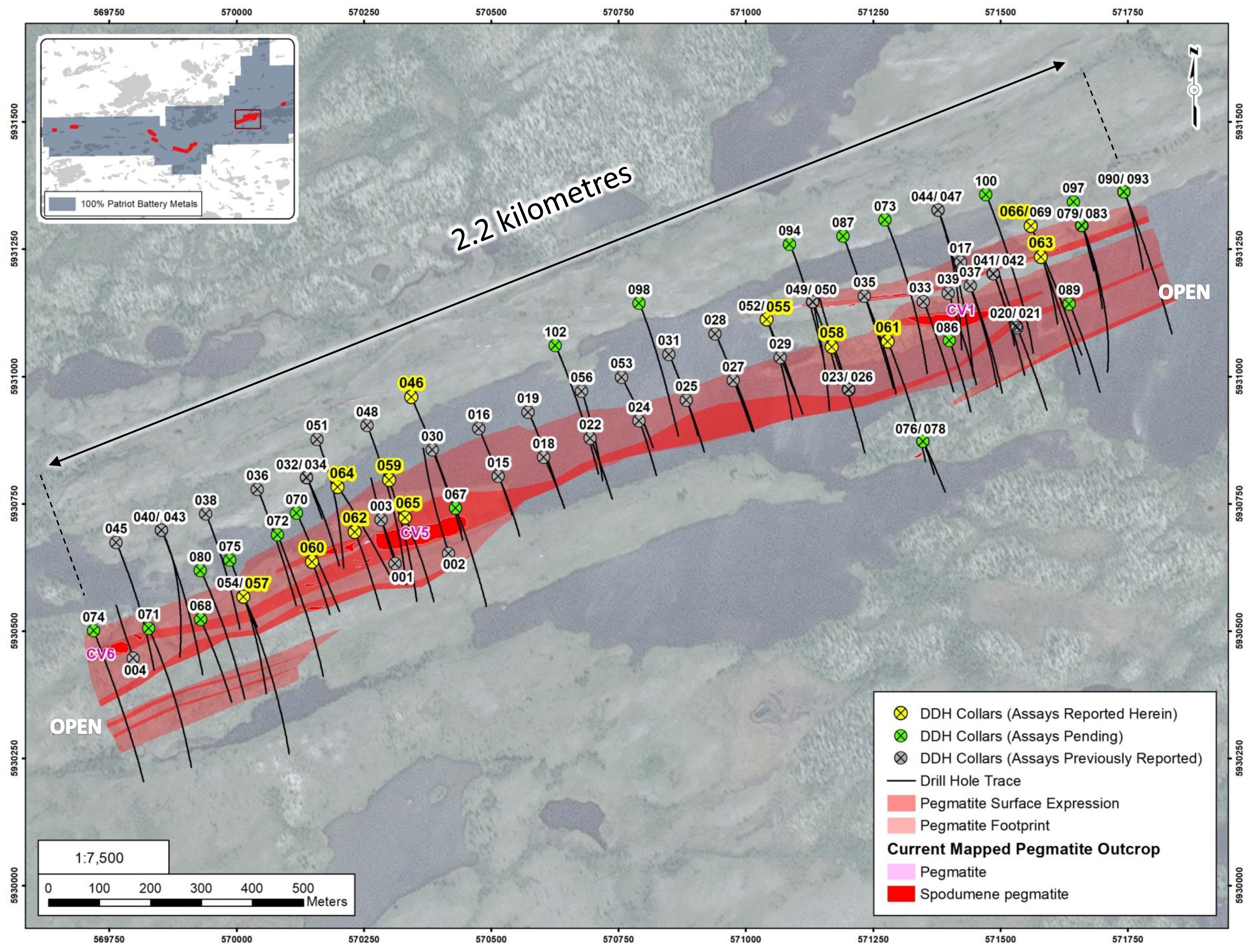 Patriot Battery Metals Inc. (the “Company” or “Patriot”) (TSX-V: PMET) (ASX: PMT) (OTCQB: PMETF) (FSE: R9GA) is pleased to announce core assay results for twelve (12) additional drill holes (CV22-046, 055, and 057 through 066) from its 2022 drill campaign at its wholly owned Corvette Property (the “Property”), located in the James Bay Region of Quebec. The primary drill area is focused at the CV5 Pegmatite, located approximately 13.5 km south of the regional and all-weather Trans-Taiga Road and powerline infrastructure.