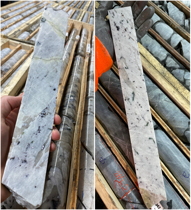 The twelve (12) drill holes (NQ core size – 47.6 mm inside diametre) reported herein targeted mineralization at shallow to mid-level depths over a significant strike length of the CV5 Pegmatite (Figure 1). Drilling continues to return wide and well-mineralized intercepts at these depths, highlighted herein by drill hole CV22-066 with 113.4 m at 1.61% Li2O (162.1 m to 275.5 m), including 38.0 m at 2.17% Li2O and 28.6 m at 2.31% Li2O. Additionally, drill hole CV22-066 contains twenty (20) individual samples over 3.00% Li2O including two (2) adjacent samples grading >6% Li2O, averaging 2.0 m at 6.41% Li2O, which contains a single spodumene crystal of approximately 1.8 m (Figures 2, and 3). This is the largest spodumene crystal discovered to date in drill core at the Property and was first reported in news release dated September 19, 2022.